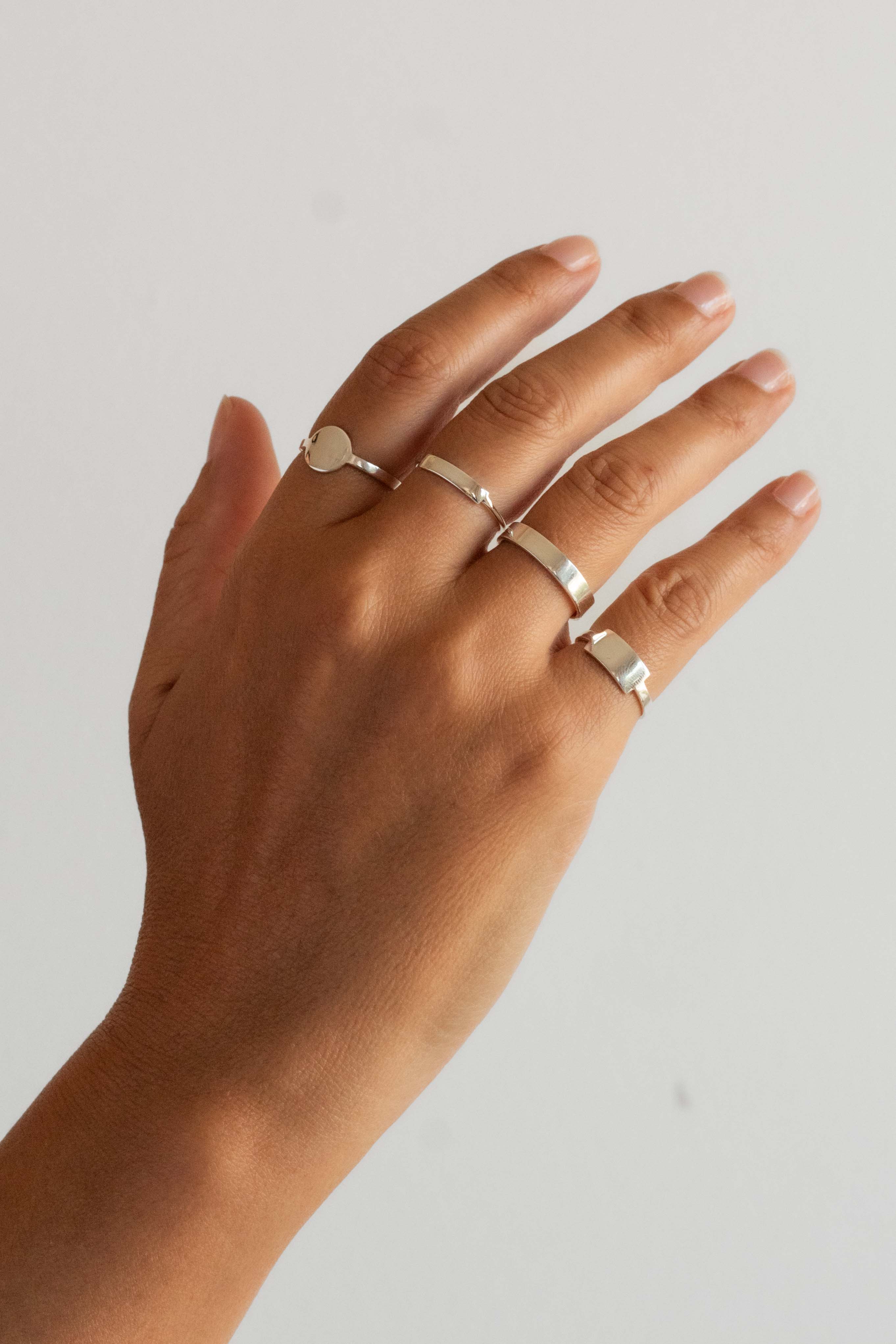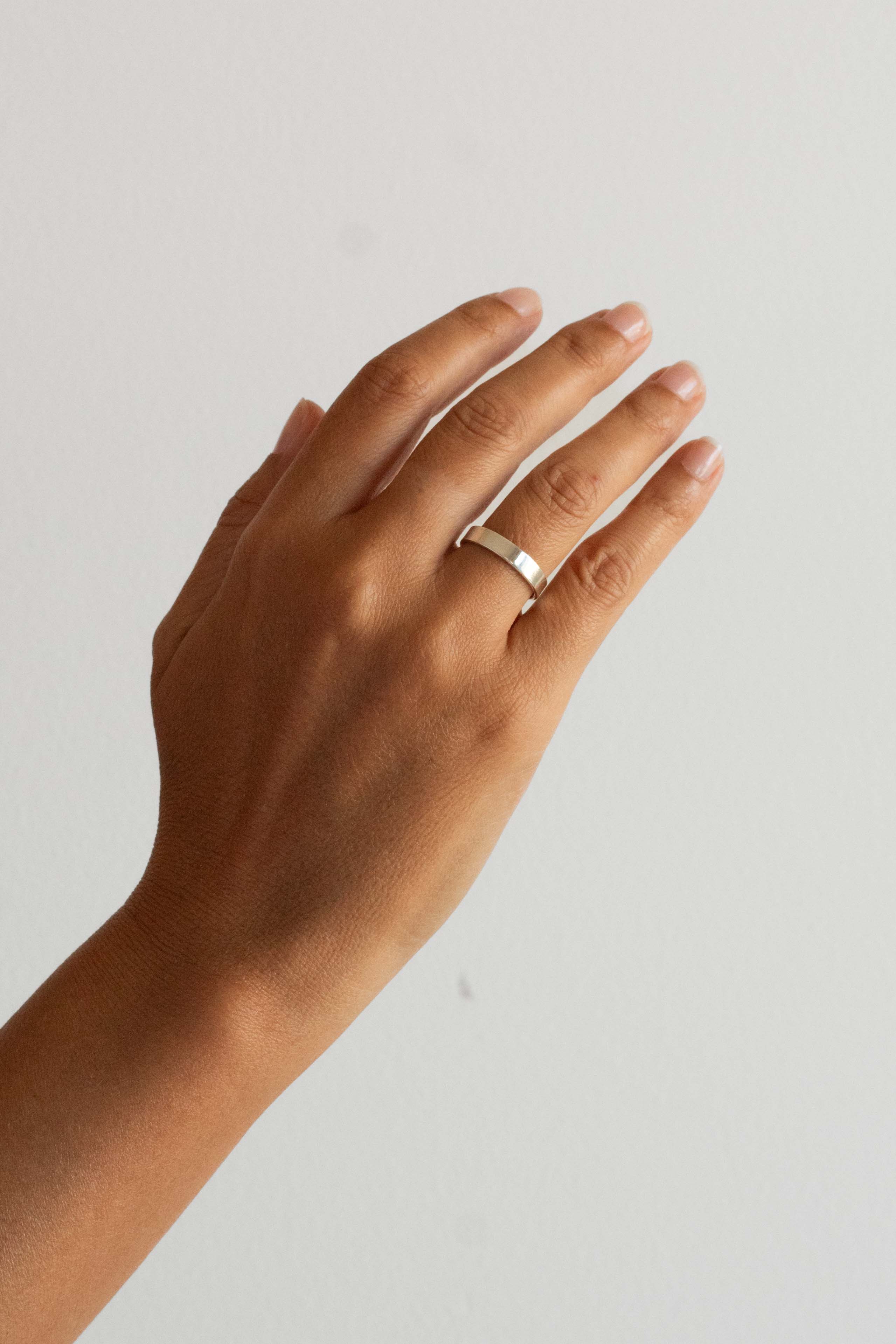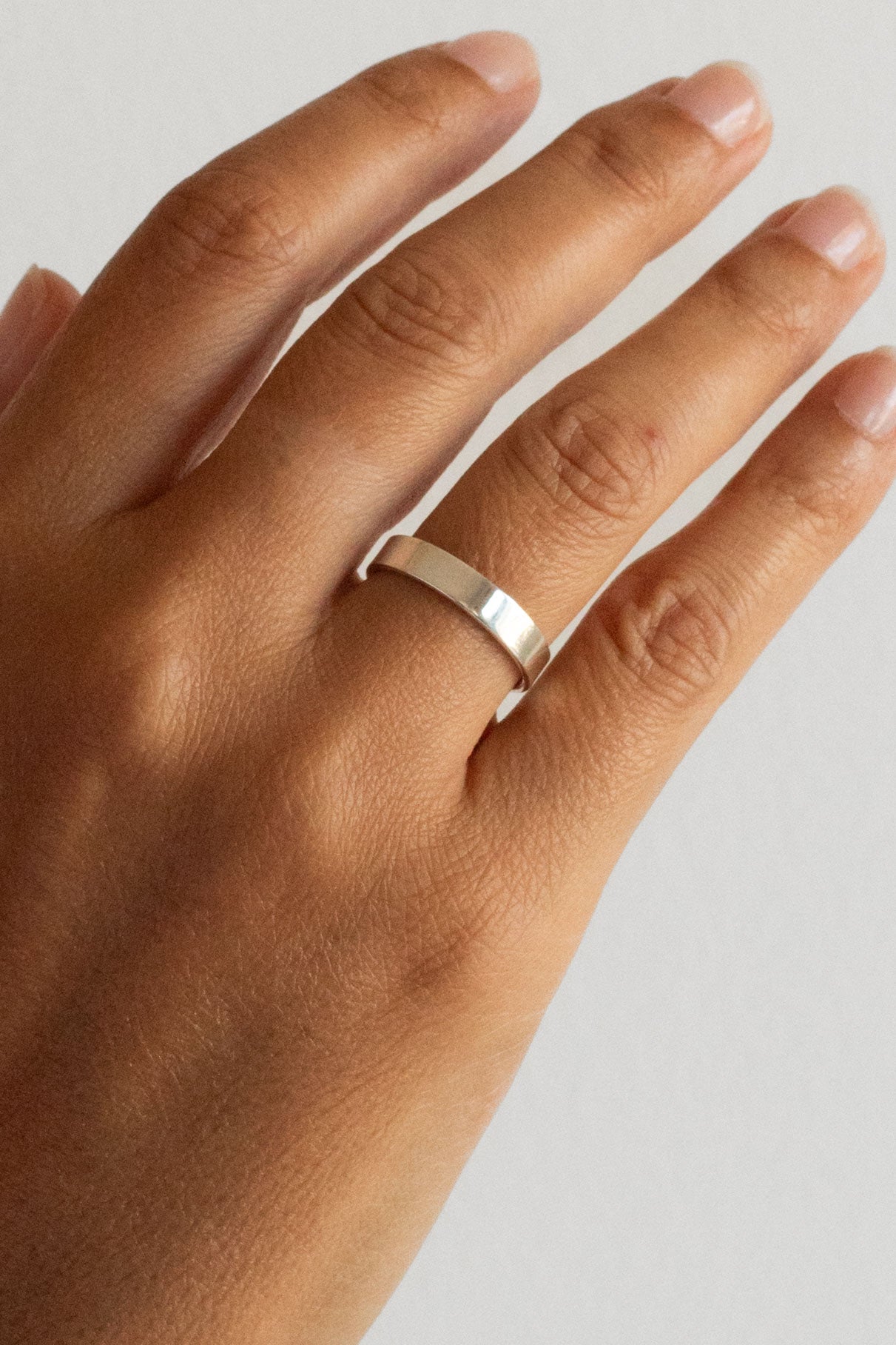Its sleek, minimalist design features a thin band topped with a slightly wider, rectangular accent. Crafted from 925 sterling silver, this piece is both durable and refined. Perfect for stacking or wearing alone, it adds a touch of understated elegance to any outfit.