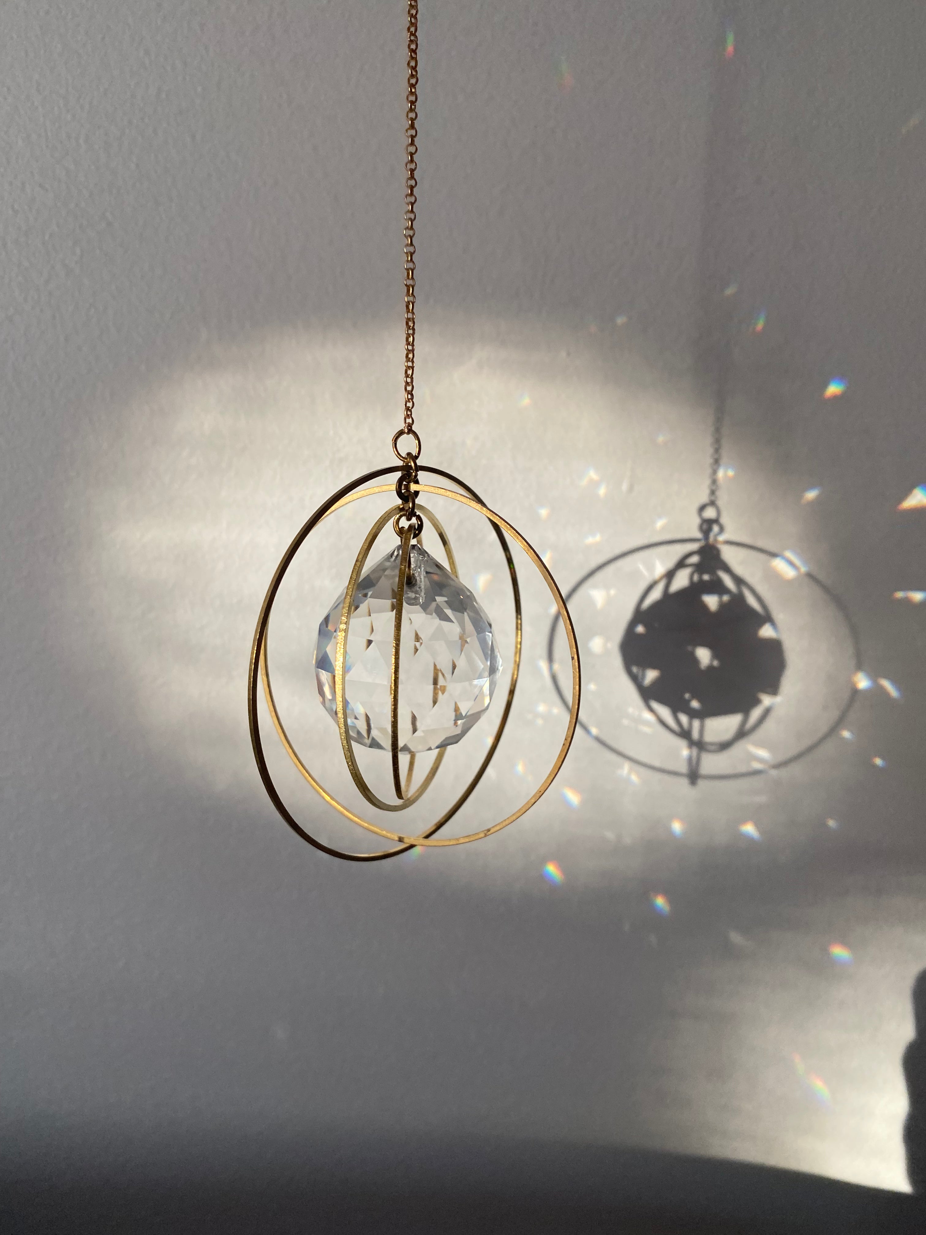 A cherished favourite reimagined with four solid brass rings that beautifully frame a 30mm glass prism. Let this stunning piece inspire you daily, casting prismatic light as a gentle affirmation of your unique role in this universe.